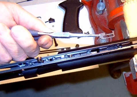 Each of the Trigger components is held by 1 pin, with the exception of the Safety Baulk Plate which is held by 2. Carefully remove each of the pins in sequence and then withdraw the Trigger Group components as they are freed. Shown (left) is the Safety Baulk Piece being withdrawn from the rifle frame.