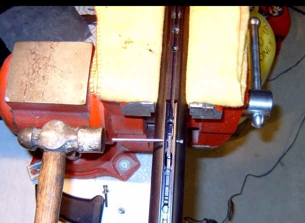 Removing the Trigger Components As we've seen, there are 3 Trigger bars and 1 Safety Catch Baulk Piece. All these components are held in place by steel pins which are an interference fit into drillings in the alloy frame of the rifle. These pins will need to be 'drifted' out using a small hammer and a suitable parallel punch, however you need to know that these pins are 'mushroomed' at one end so that they grip tightly when driven into their respective drillings. Because of this they should be removed so that the mushroomed end is not driven through the frame, thus enlarging the drillings. Therefore, the correct direction in which to drive them out must be ascertained. With the rifle inverted and looking at the underside of the frame as shown, the correct direction in which to drift the pins is from Left to Right. This will ensure that the mushroom heads of the pins emerge from their drilling without causing damage. However this may not be the case with YOUR rifle as the pins may have been previously removed. Therefore close inspection of the pins before commencing withdrawal will reveal the correct direction as the mushroomed heads have tiny irregularities which the opposing end doesn't have. Tap on the non-irregular end.